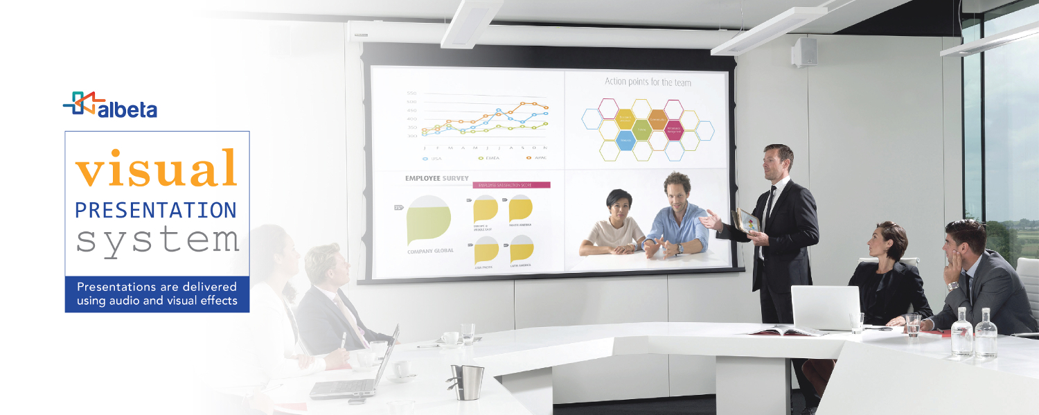 Presentation & A/V System Presentasi dilakukan menggunakan efek audio & visual untuk memukau hadirin. Gambar, kata-kata dan video dapat diproyeksikan dengan jelas kepada penonton berjumlah berapa pun juga. Efek - efek ini penting dalam menstimulasi berbagai suasana hati. Sehingga pembicara dapat memberikan pembukaan yang dramatis, berlanjut ke puncak yang sangat menarik dan diakhiri dengan penutupan yang paling mengesankan. Dalam trend sekarang ini, setiap media presentasi memiliki perkembangan teknologi yang sangat cepat dari sistem analog berubah ke sistem digital. Sistem presentasi visual yang kami miliki dapat disesuaikan untuk berbagai skala, dari ruang meeting, auditorium, hingga stadion. System kami stabil, bersifat future-proof lengkap dengan pendukung multi-format. Solusi - solusi audio visual dari Albeta selalu mengedepankan tiga kriteria diatas dan didukung dengan produk - produk terbaik.